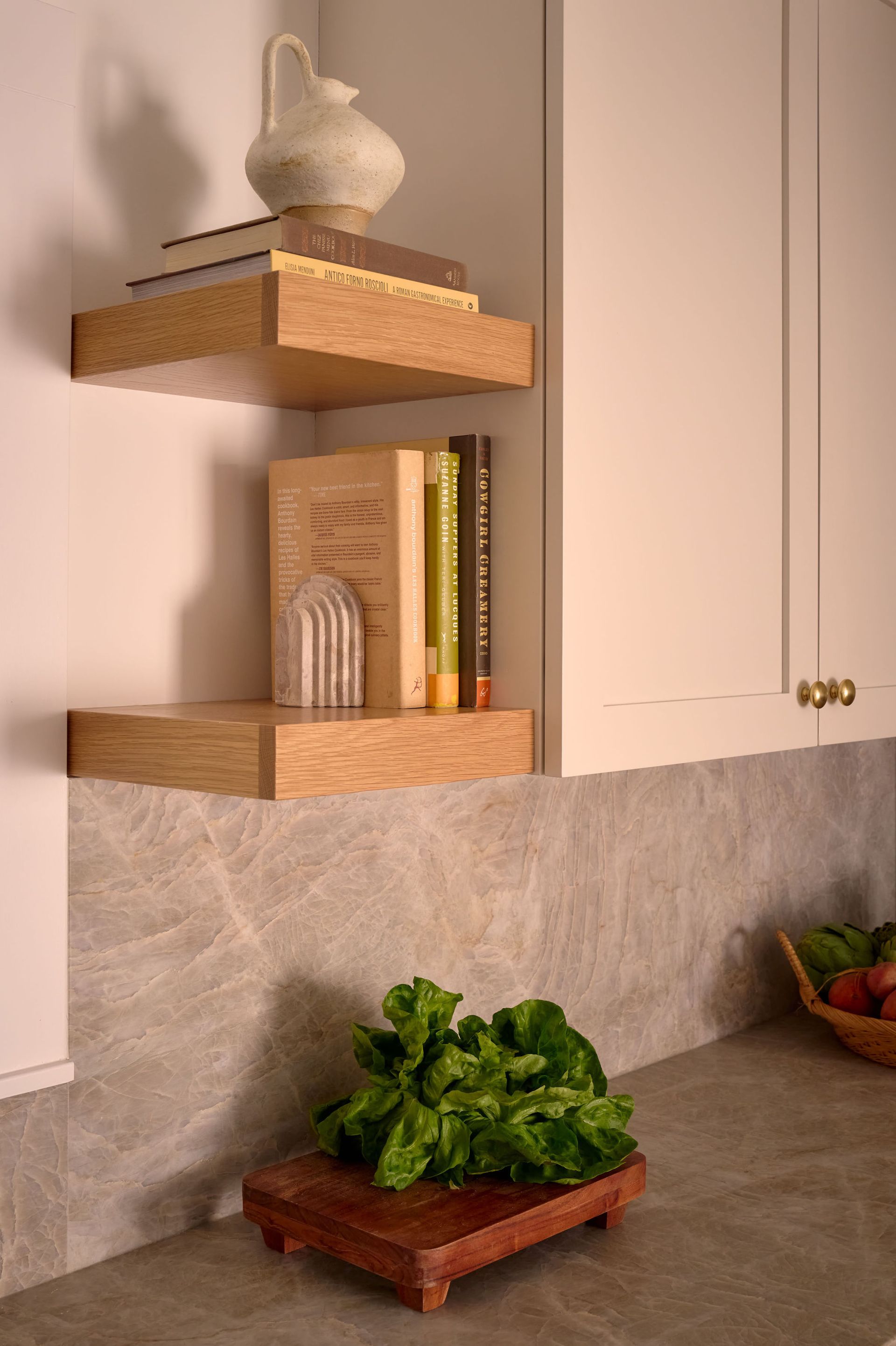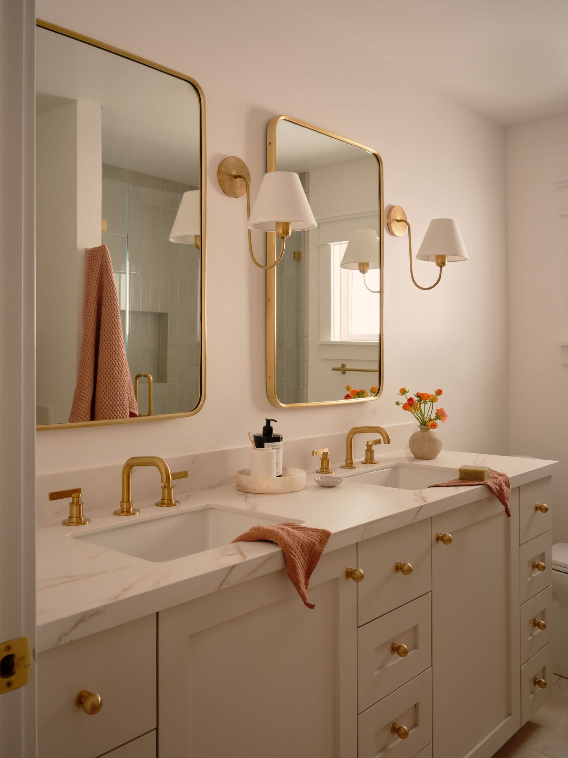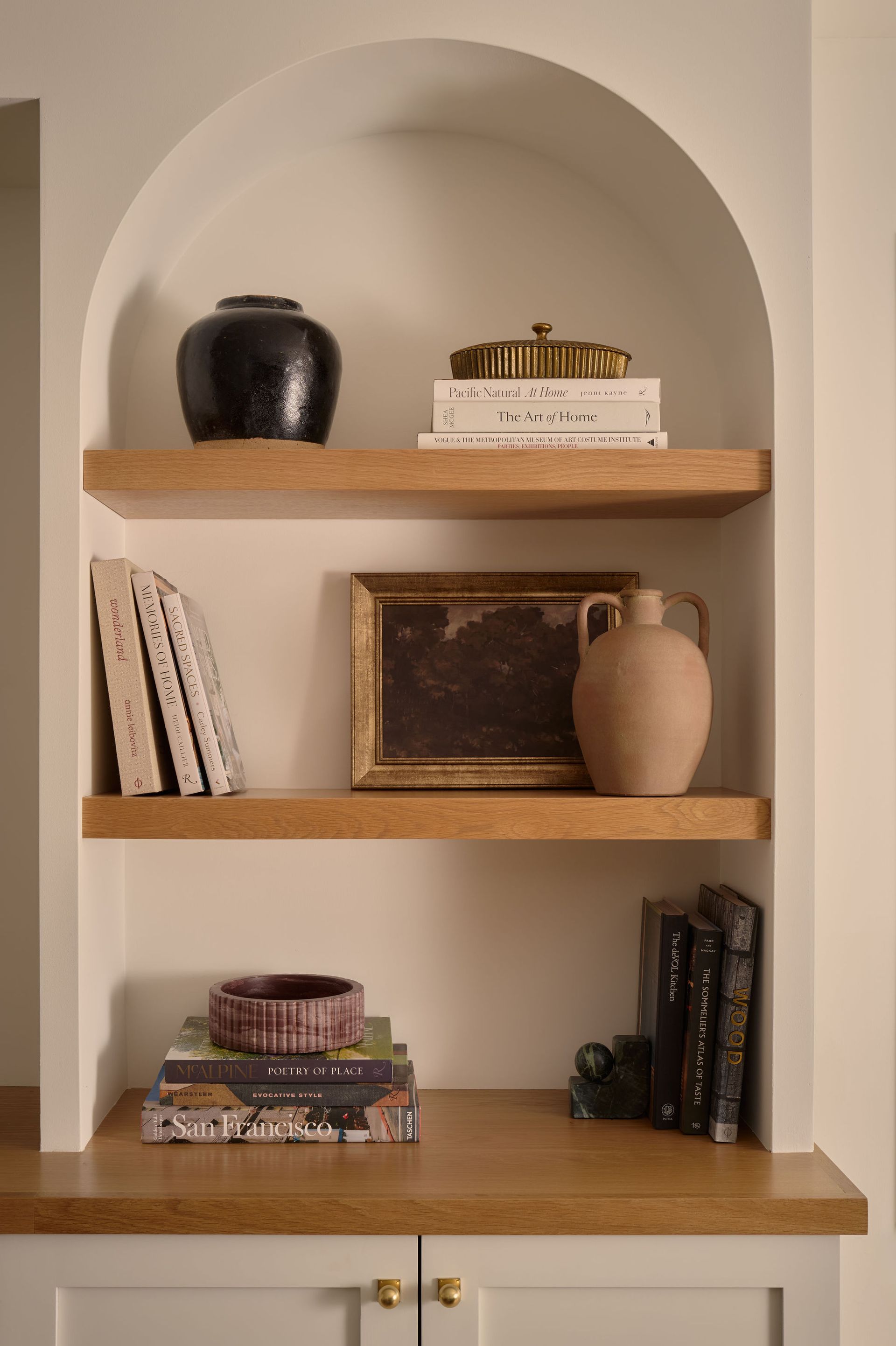 In the bathroom, a double vanity and expanded storage make busy mornings more efficient, while maintaining the same calm, elevated palette. Custom niches and open shelving add both display and practical storage moments, ensuring everything has a place without feeling cluttered. The result is a cohesive, light-filled renovation that balances beauty with the practical needs of a growing family.